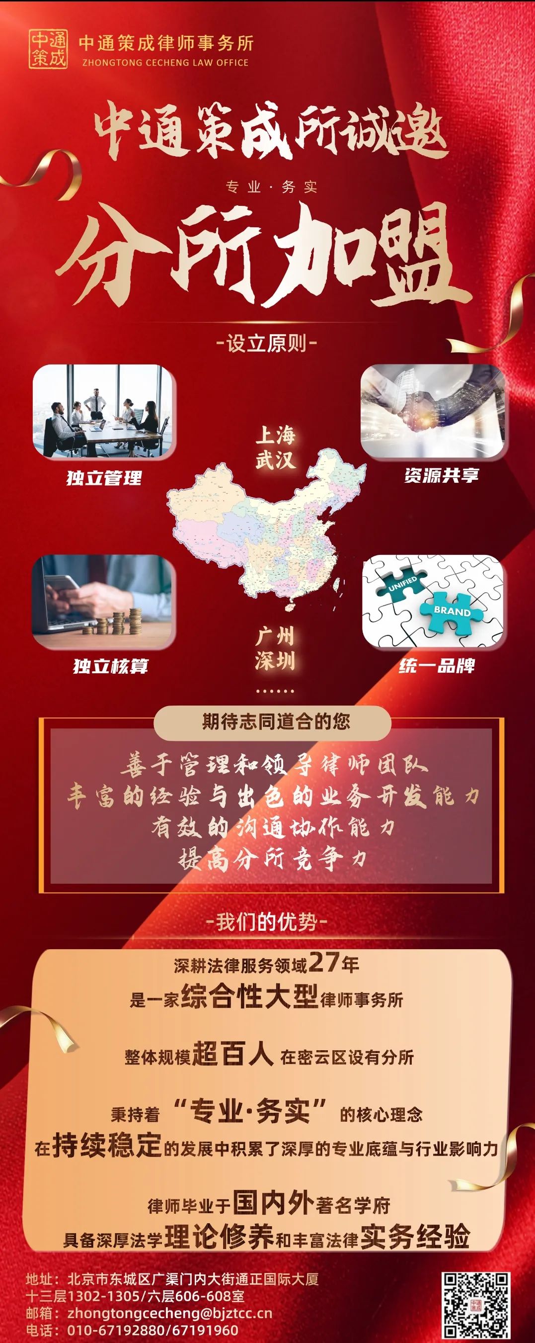 1998年,中通策成所以"专业 · 务实"为核心理念,扎根北京,成就百人律所之规模,二十七载深耕法律沃土,初心如磐。现我所正式启动京外分所共建计划——以专业丈量法治进程,用务实书写行业新篇。合作咨询:请私信留言"分所共建+地区",官网直达:https://www.bjztcc.cn/。聚力一线,共拓新章,北京市中通策成律师事务所期待与您携手共赢。